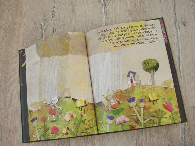 Dzieci zapraszają się nawzajem do swoich światów. Świat dziewczynki jest słoneczny, radosny, mieniący się wieloma kolorami, zwariowany, pełen marzeń i planów na przyszłość. Świat Ignatka jest mroczny, tajemniczy, ze śpiącymi motylami i biblioteką pełną książek, ale nie jest smutny. Te różnice zostały zaakcentowane głównie w warstwie graficznej książki, która wyraźnie rozdziela świat Ignatka od świata dziewczynki, ale nie wskazuje, który z nich jest lepszy, bo i tu, i tu mają miejsce niezwykłe zdarzenia. Oba światy po prostu istnieją. Trzeba też dodać, że książka jest pięknie ilustrowana, co mam nadzieję widać na moich zdjęciach.