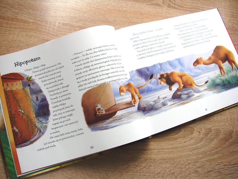 Historia potopu znana jest chyba wszystkim; nawet tym, którzy w nią nie wierzą;-) Biblia należy do kanonu arcydzieł literackich, a niektóre z zawartych w niej opowieści przerabiane są w szkołach (przynajmniej tak było za moich czasów) i nie wpada ich nie znać. Na rynku wydawniczym dostępnych jest wiele książek z biblijnymi opowieści w wersji dla najmłodszych. „Opowieści z Arki Noego” w przystępny, zabawny i optymistyczny sposób ukazują historię 10 zwierząt, które musiały w swoim towarzystwie czekać aż przestanie padać deszcz.