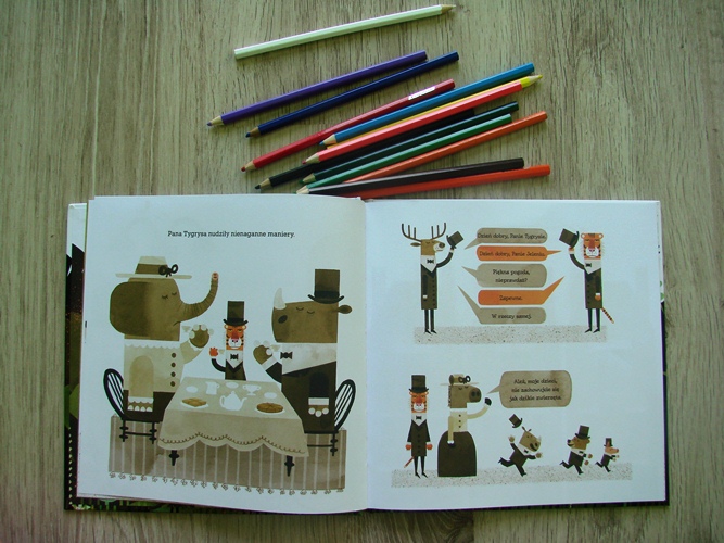„Pan Tygrys dziczeje” opowiada krótką historię tygrysa, żyjącego w mieście, który jest rozczarowany i znudzony powagą i nienagannymi manierami otaczających go dam i dżentelmenów. Pewnego dnia mówi: dość i decyduje się na wcielenie w życie szalonego pomysłu. Jakby to powiedzieli dżentelmeni i damy, zaczyna dziczeć. Najpierw ucieka do dziczy, gdzie korzysta z uroków życia w naturalnym dla siebie środowisku, ale potem wraca do miasta, bo zaczyna tęsknić z bliskimi. Na początku wszyscy mu się ostrożnie przyglądają, śmieją się, dziwią, bo wygląda i zachowuje się inaczej niż oni, ale po pewnym czasie… chyba zaczynają mu zazdrościć tej swobody. Po powrocie z dziczy do miasta zauważa, że coś się zmieniło. Co, doczytajcie sami:-) Dodam tylko, że ta niewielka, pięknie ilustrowana książka, na pewno przyda się w domowej biblioteczce, ponieważ na jej podstawie w bardzo prosty sposób można wytłumaczyć dziecku, czym jest szacunek i tolerancja.