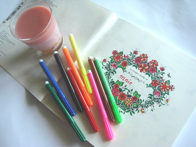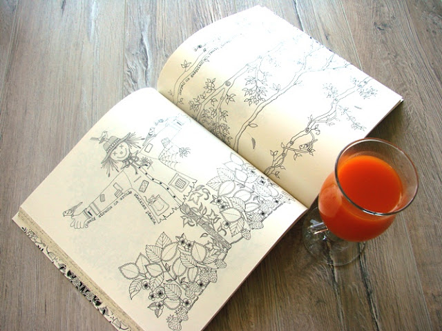 Chciałam jeszcze zwrócić Waszą uwagę na wydanie.Autorka radzi kolorować flamastrami, a rysować cienkopisami, co wiąże się z ryzykiem przebijania kolorów na drugiej stronie kartki, na której też znajduje się rysunek. Mimo że kartki wcale nie są specjalnie grube, ich jakość wyklucza przebicia, o ile nie będziecie przyciskać mocno flamastrów.
